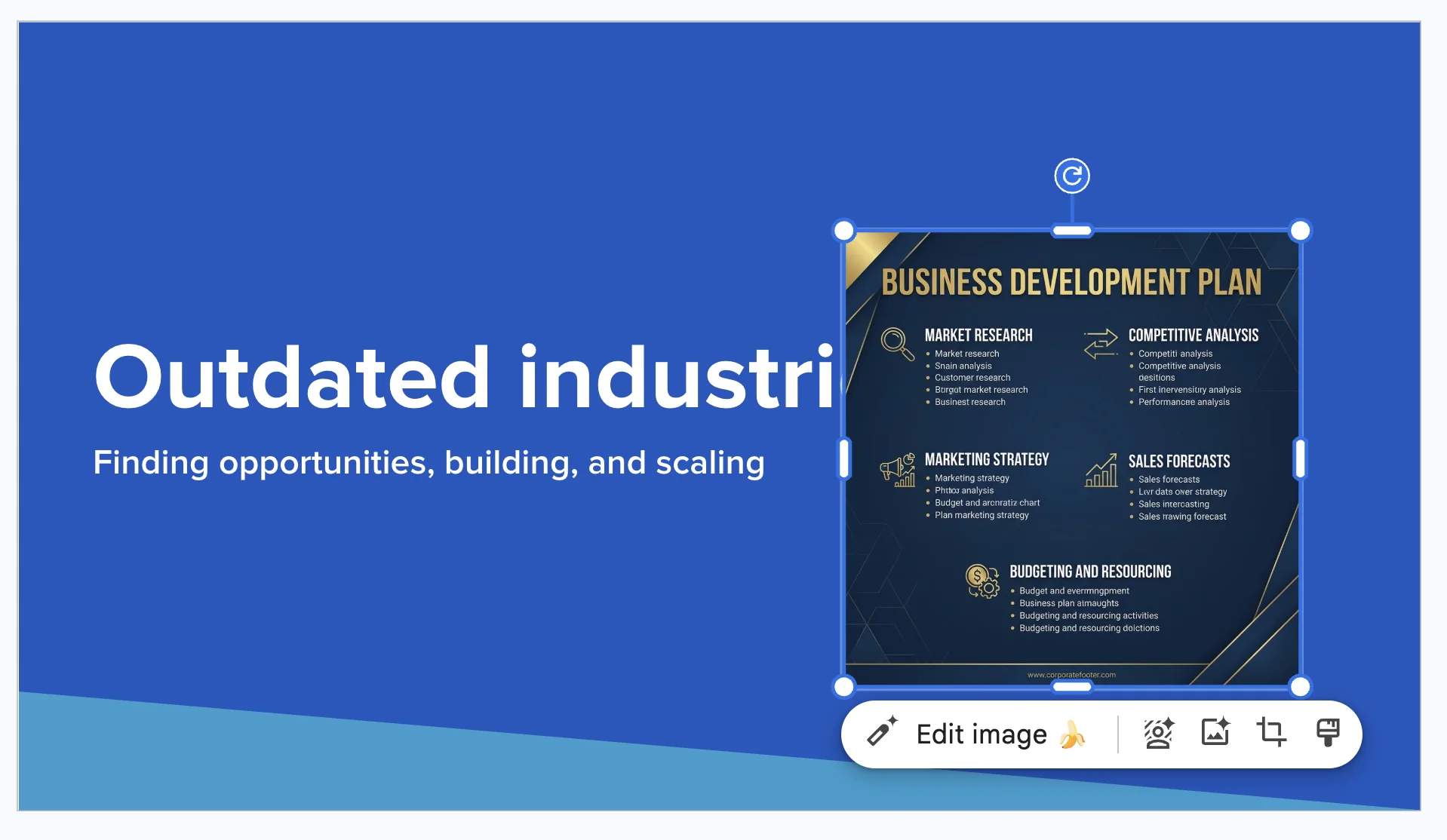Google Slides' simplicity is also why image editing feels lightweight. A lot of visual work happens through small inline controls on the selected asset, not through a richer design workspace with side panels, stock libraries, and layout tools like Canva's.