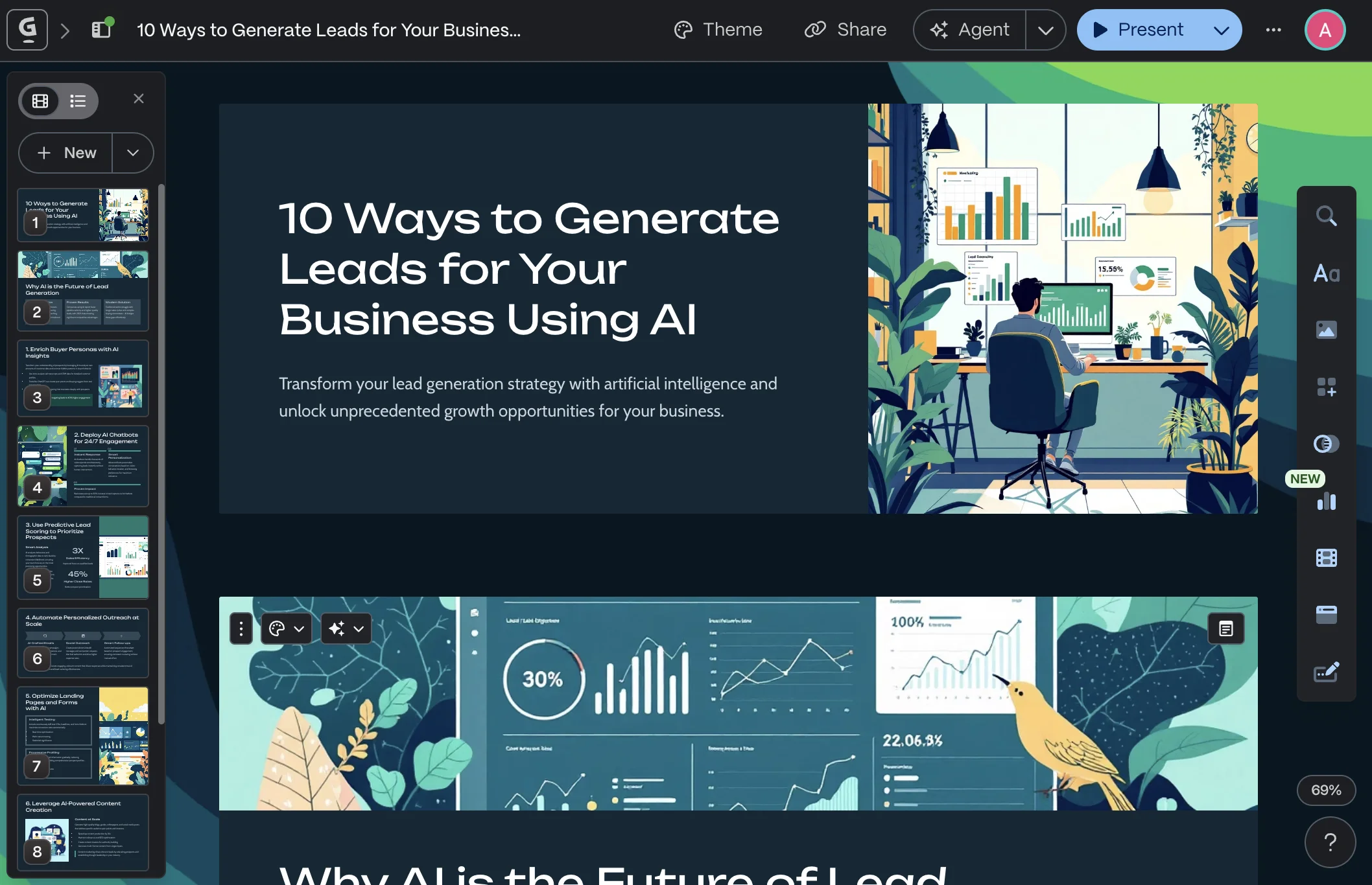 Gamma Agent. The AI assistant lets you refine presentations conversationally: "add more detail to the market section" or "make the conclusion stronger." The agent can also do web research to pull in relevant information.