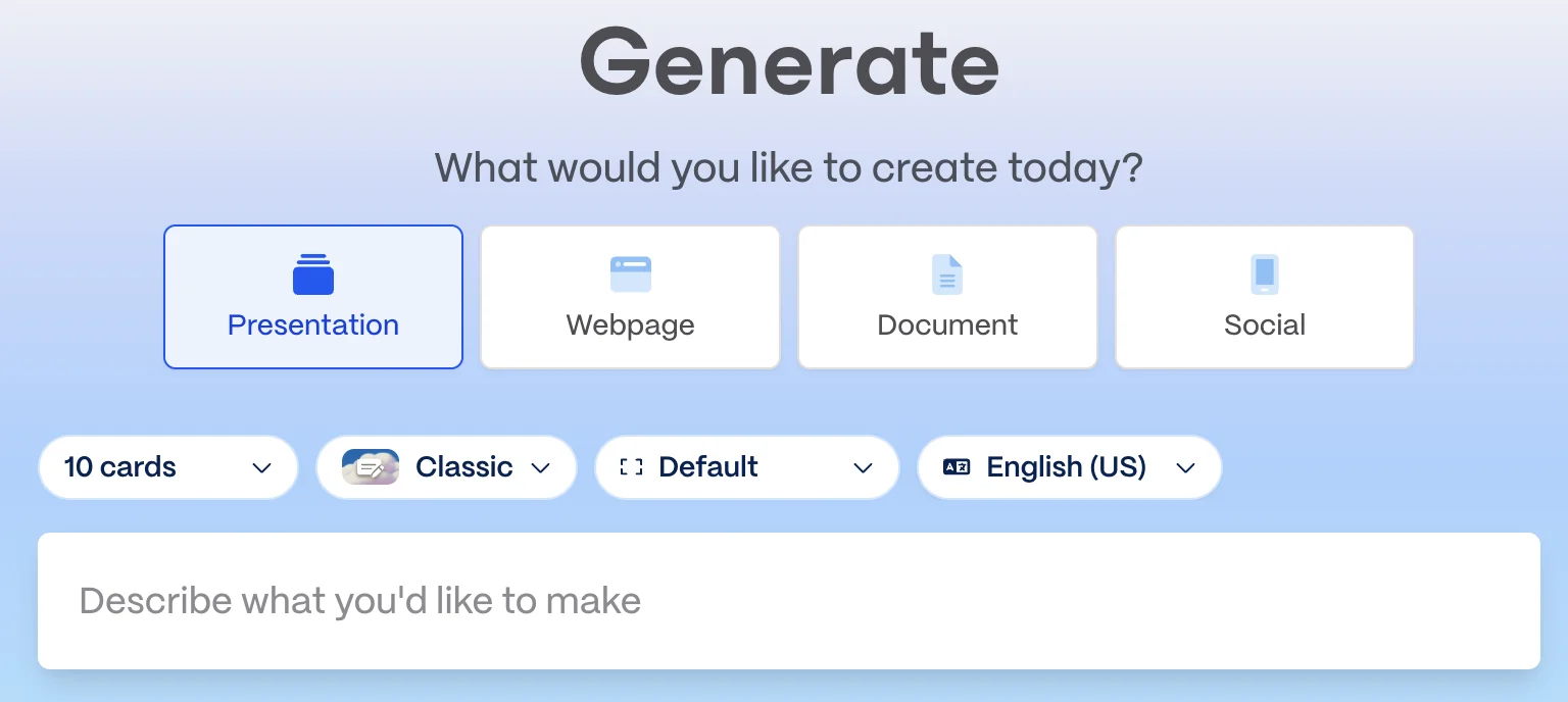 The fastest path into Gamma is its Generate flow: choose the card count, tone, language, and output type, then give it a prompt. That's convenient, but it also shows Gamma's core model. You're steering a preset generation system, not composing on an open design canvas.