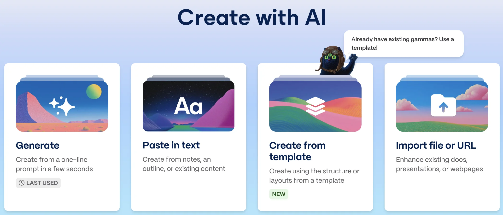 Multiple starting points. Gamma's current create flow includes Generate (from a topic), Paste in text, Create from template, and Import file or URL. That range is especially useful when you already have raw content, a document, or an existing structure to work from.