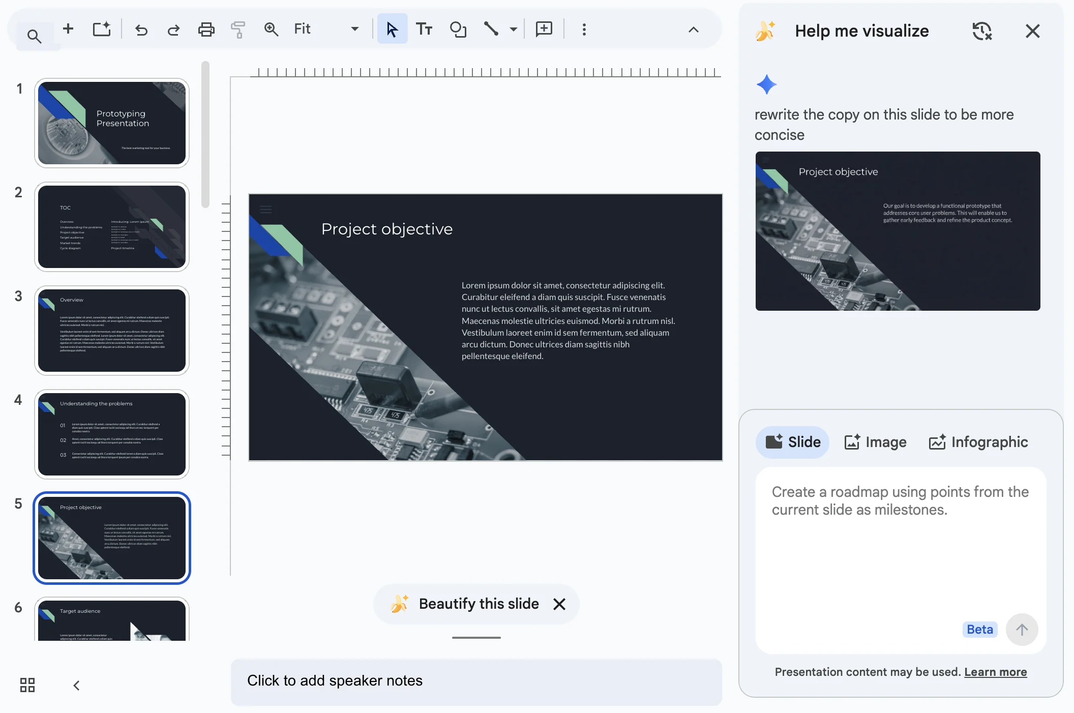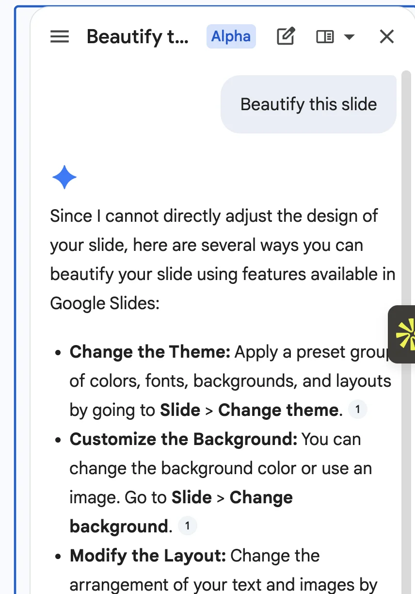 The limitation is that Gemini often stops at guidance. In the sidebar, it may suggest theme changes, background updates, or layout tweaks, but it isn't acting like a full design agent that can take over the presentation and turn it into something polished on its own.