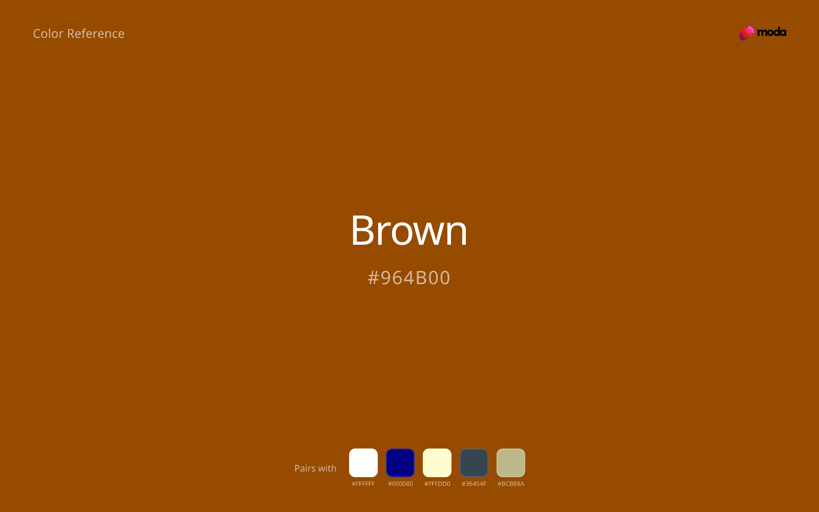 The hex code for brown is #964B00. In RGB, that's 150 red, 75 green, and 0 blue. The approximate CMYK equivalent is 0% cyan, 50% magenta, 100% yellow, and 41% key (black).