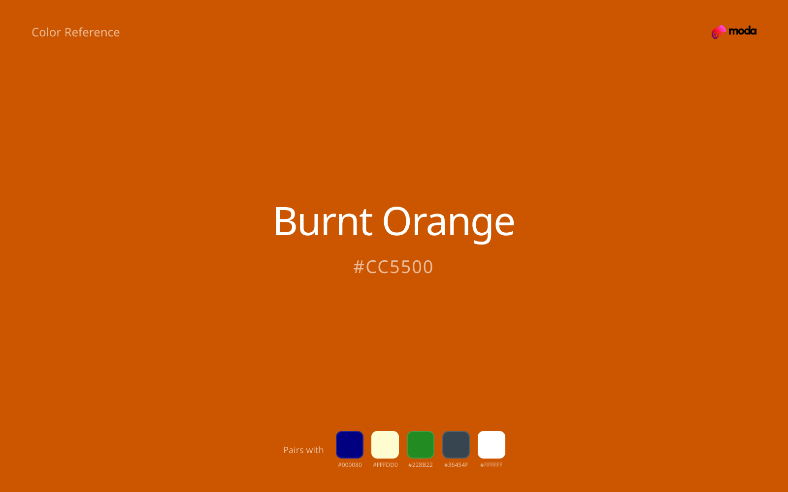 Burnt orange (#CC5500) is a deep, warm orange that feels more mature and earthy than pure orange. It works as a primary or accent color for creative, outdoor, and heritage brands.