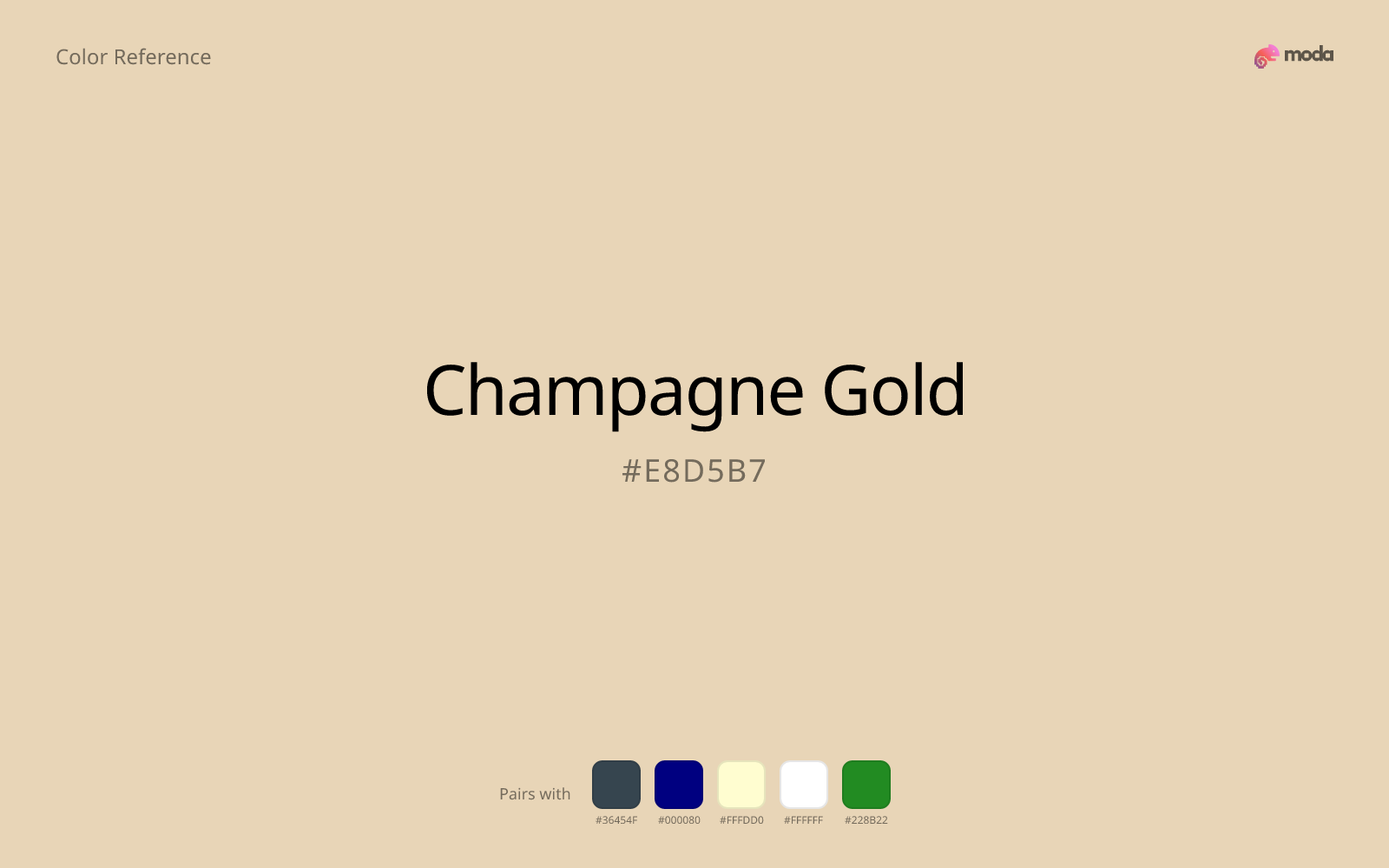The hex code for champagne gold is #E8D5B7. In RGB, that's 232 red, 213 green, and 183 blue. The approximate CMYK equivalent is 0% cyan, 8% magenta, 21% yellow, and 9% key (black).