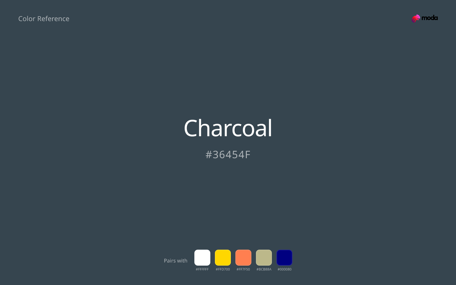 Charcoal (#36454F) is a soot-dark blue-gray that keeps the authority of black while feeling less absolute on screen. It is the dark neutral people often want when pure black feels too stark, especially in typography, UI chrome, and polished presentation themes.