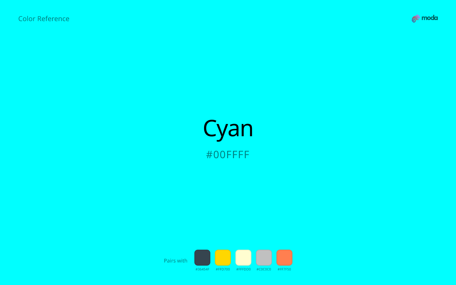 Cyan is often associated with modernity, clarity, and digital freshness, sometimes with a clinical or futuristic edge. Compared with blue or electric blue, it tends to read as greener, cooler, and more screen-native.
