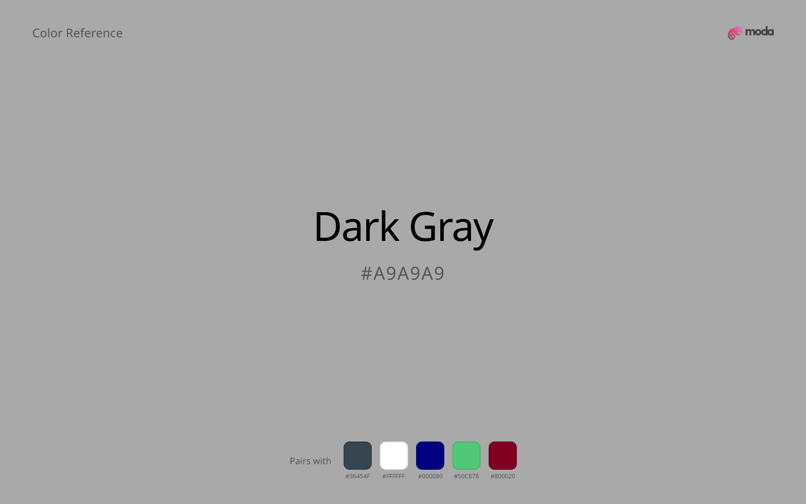 The hex code for dark gray is #A9A9A9. In RGB, that's 169 red, 169 green, and 169 blue. The approximate CMYK equivalent is 0% cyan, 0% magenta, 0% yellow, and 34% key (black).