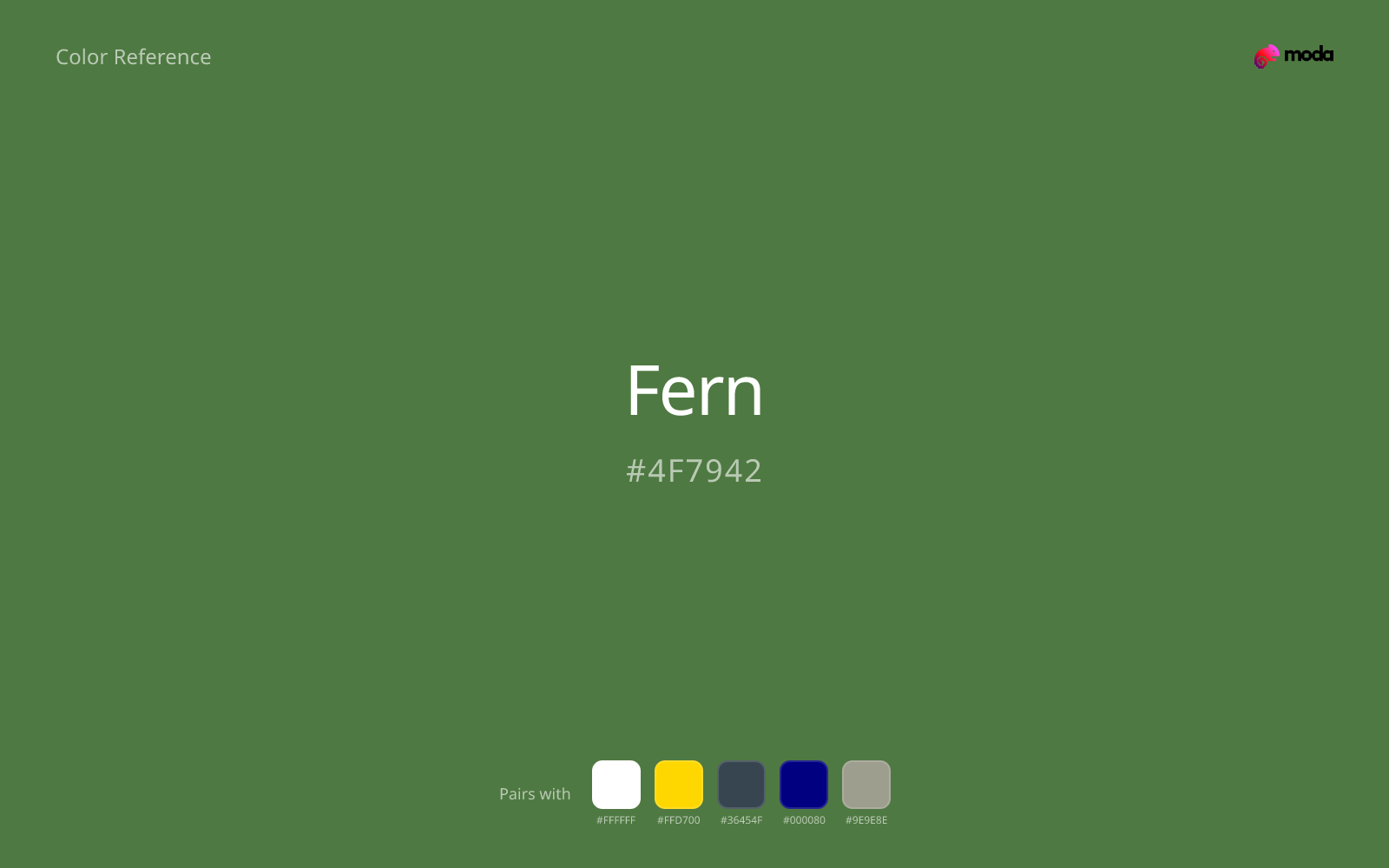 The hex code for fern is #4F7942. In RGB, that's 79 red, 121 green, and 66 blue. The approximate CMYK equivalent is 35% cyan, 0% magenta, 45% yellow, and 53% key (black).