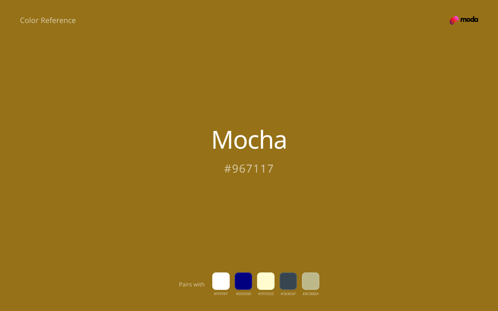 The hex code for mocha is #967117. In RGB, that's 150 red, 113 green, and 23 blue. The approximate CMYK equivalent is 0% cyan, 25% magenta, 85% yellow, and 41% key (black).