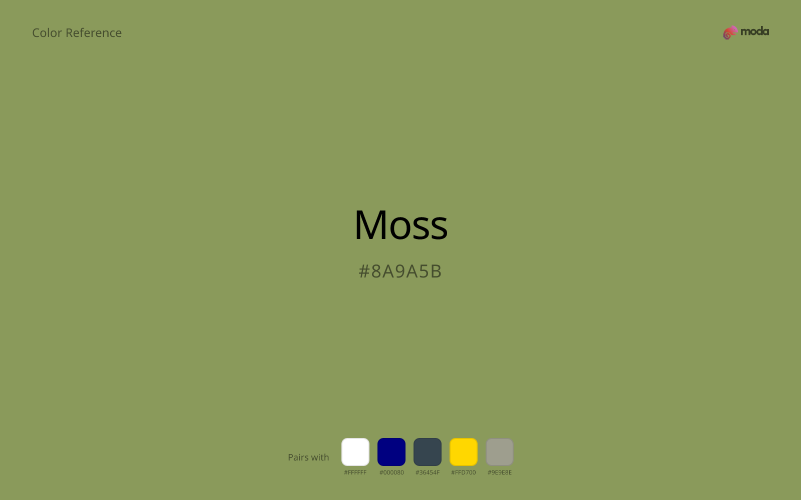 The hex code for moss is #8A9A5B. In RGB, that's 138 red, 154 green, and 91 blue. The approximate CMYK equivalent is 10% cyan, 0% magenta, 41% yellow, and 40% key (black).