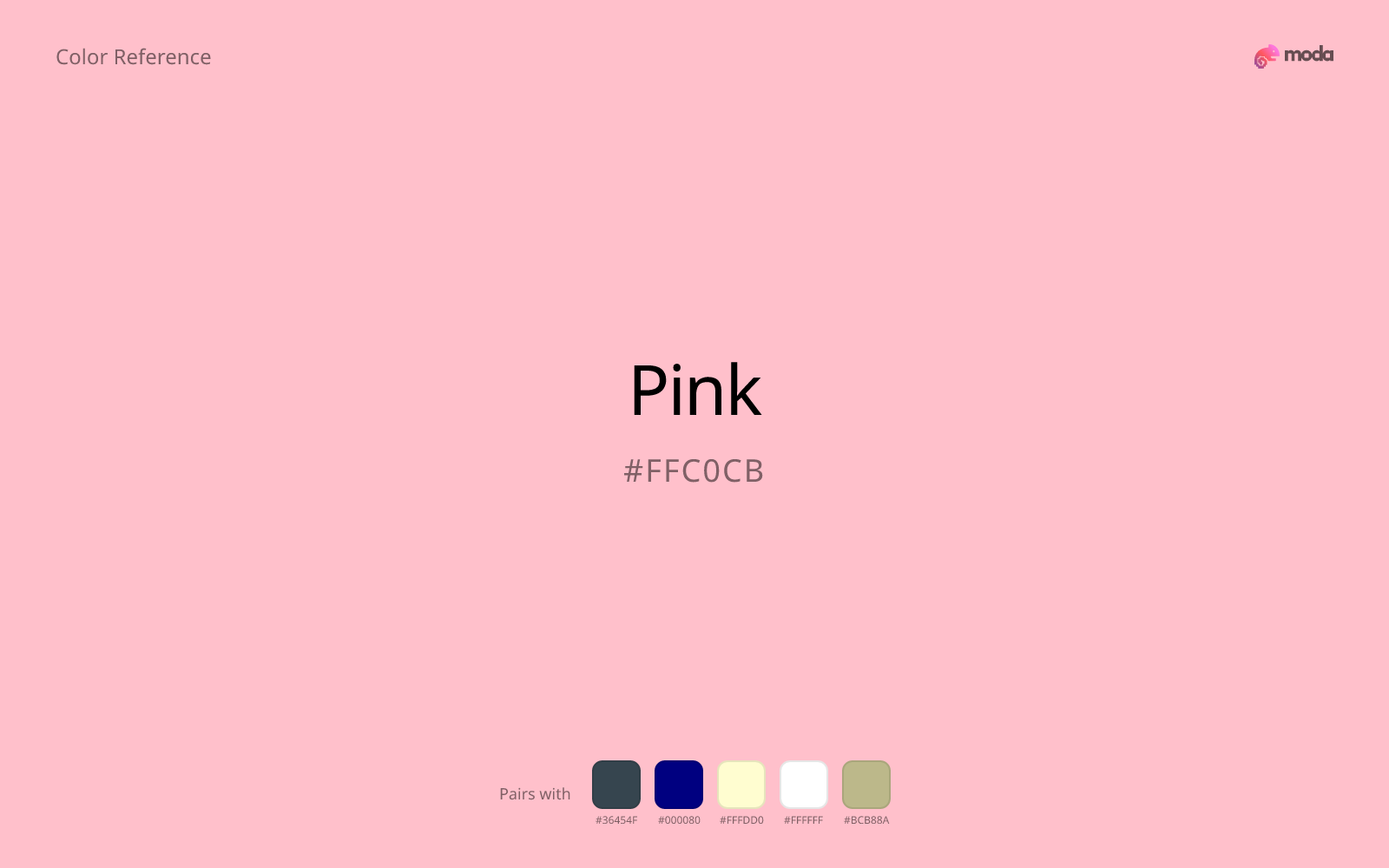 The hex code for pink is #FFC0CB. In RGB, that's 255 red, 192 green, and 203 blue. The approximate CMYK equivalent is 0% cyan, 25% magenta, 20% yellow, and 0% key (black).