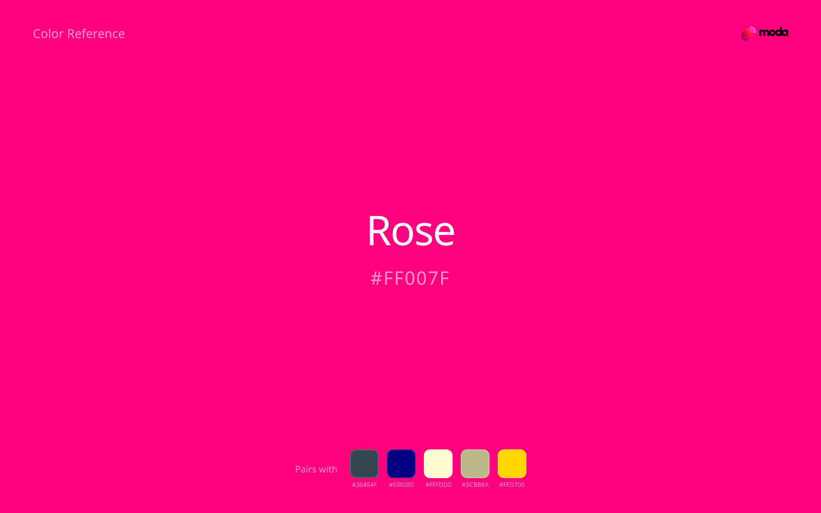 Rose (#FF007F) is a vivid pink-red that feels more assertive than blush and more polished than hot pink. It works when a brand needs warmth, personality, and visible contrast without crossing into neon territory.