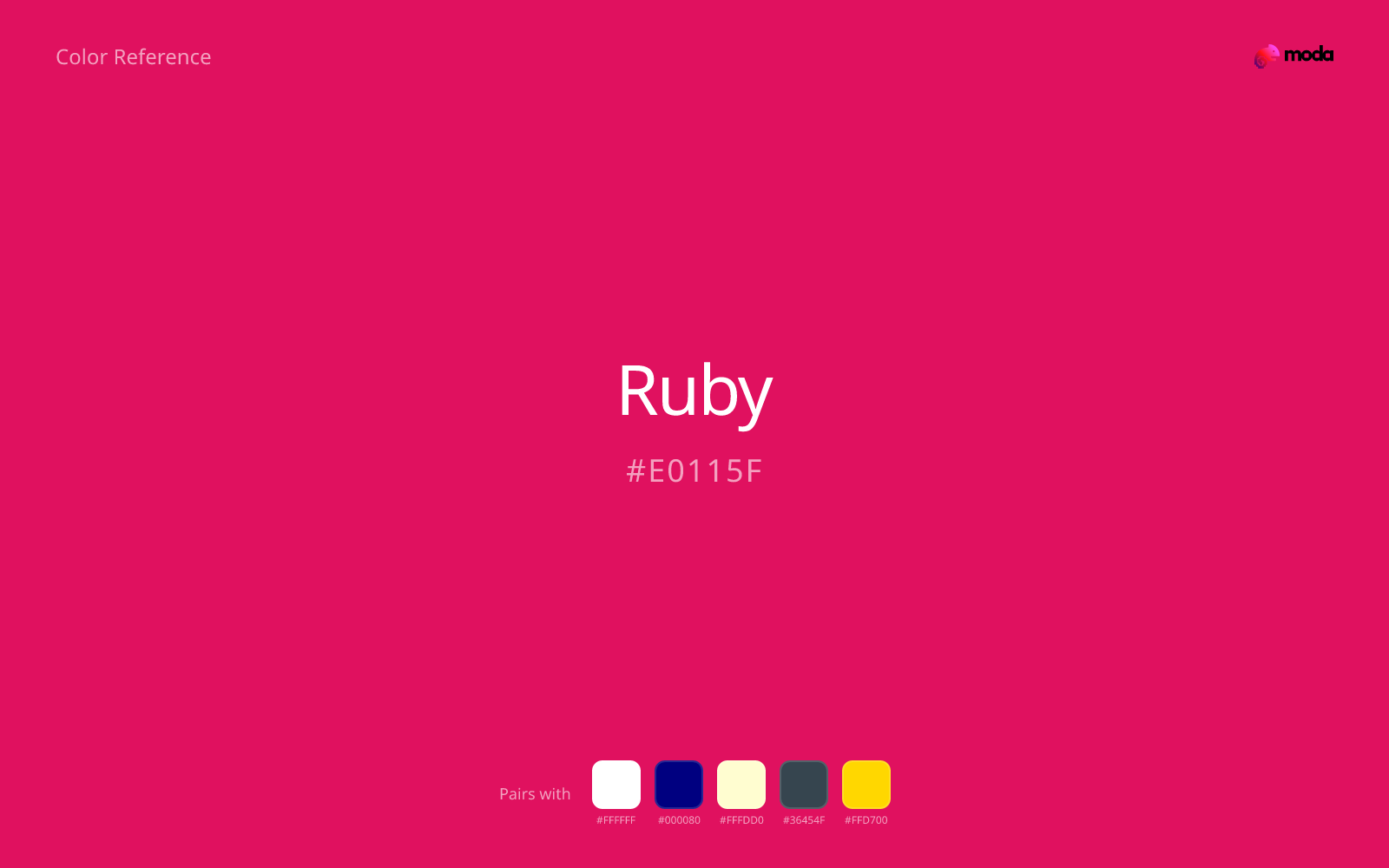 - •Ruby has the saturation to lead a brand palette — strong enough for buttons, headers, and packaging without drifting into pastel or dark territory.