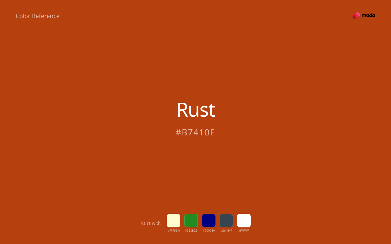 Rust (#B7410E) is a warm, earthy red-orange that evokes autumn, vintage aesthetics, and natural materials. It works as a distinctive primary or accent color for brands seeking warmth without the intensity of pure orange.