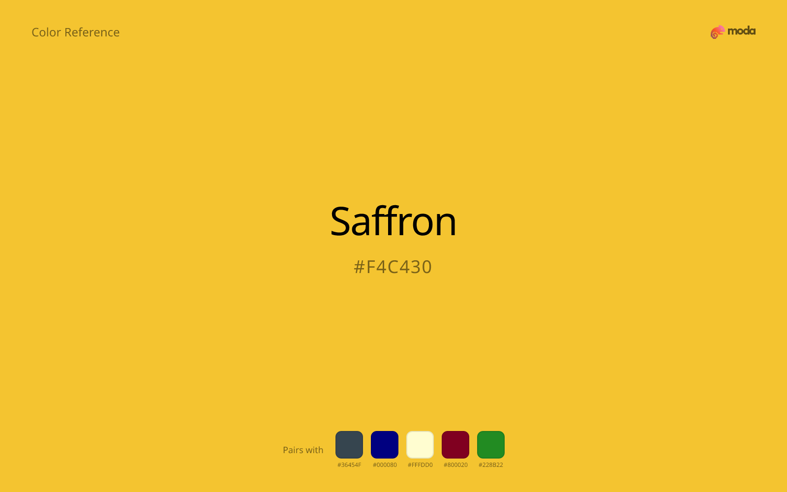The hex code for saffron is #F4C430. In RGB, that's 244 red, 196 green, and 48 blue. The approximate CMYK equivalent is 0% cyan, 20% magenta, 80% yellow, and 4% key (black).