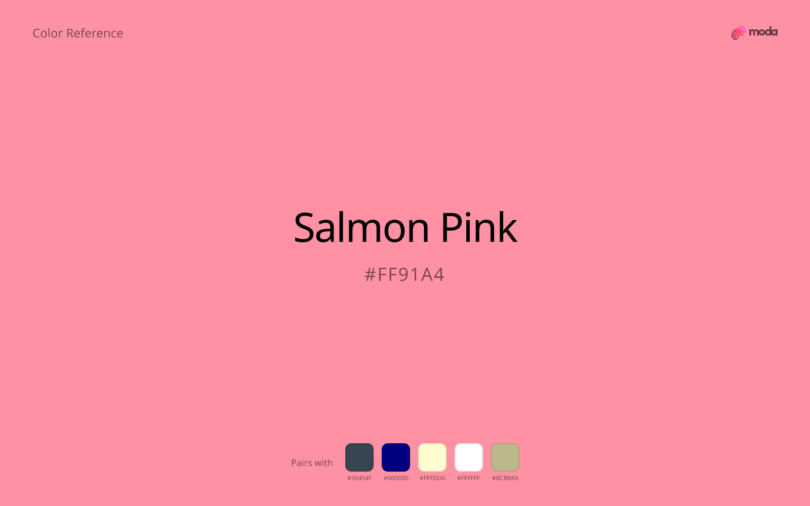 The hex code for salmon pink is #FF91A4. In RGB, that's 255 red, 145 green, and 164 blue. The approximate CMYK equivalent is 0% cyan, 43% magenta, 36% yellow, and 0% key (black).