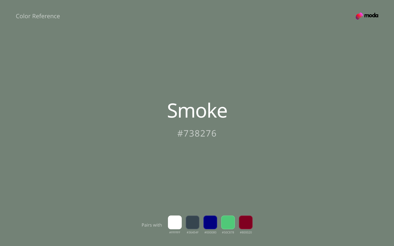The hex code for smoke is #738276. In RGB, that's 115 red, 130 green, and 118 blue. The approximate CMYK equivalent is 12% cyan, 0% magenta, 9% yellow, and 49% key (black).