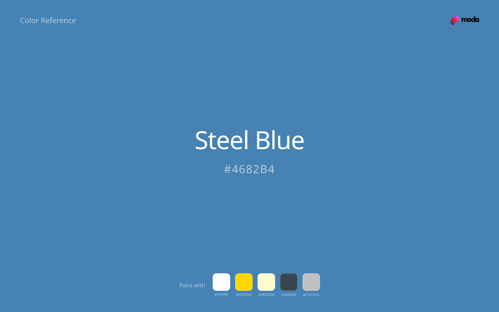 Cool metal without chrome glare — this is the blue-gray of tools, bridges, and office chairs. #4682B4 communicates function before feeling. In UI, it often stands in for "serious SaaS."