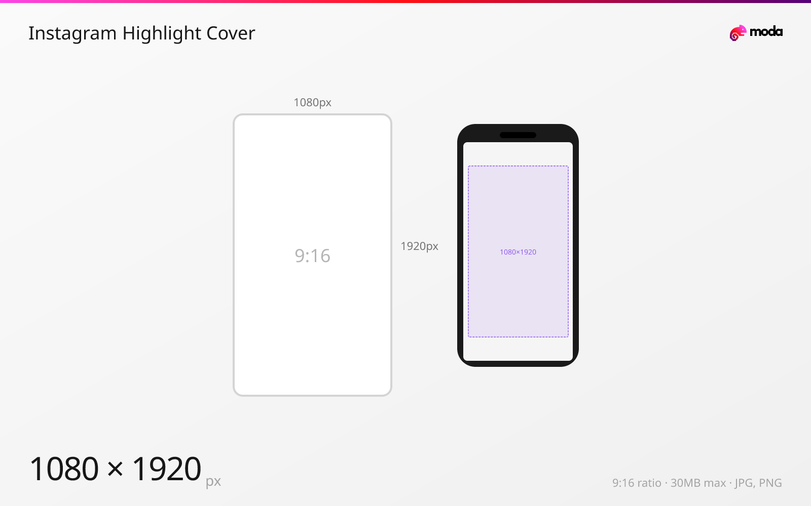 Instagram highlight covers use the same 1080×1920px story dimensions, but only the center portion is visible since highlights display as small circles on your profile. Design your icon or graphic within the center ~720×720px area to ensure it displays correctly in the circular crop.