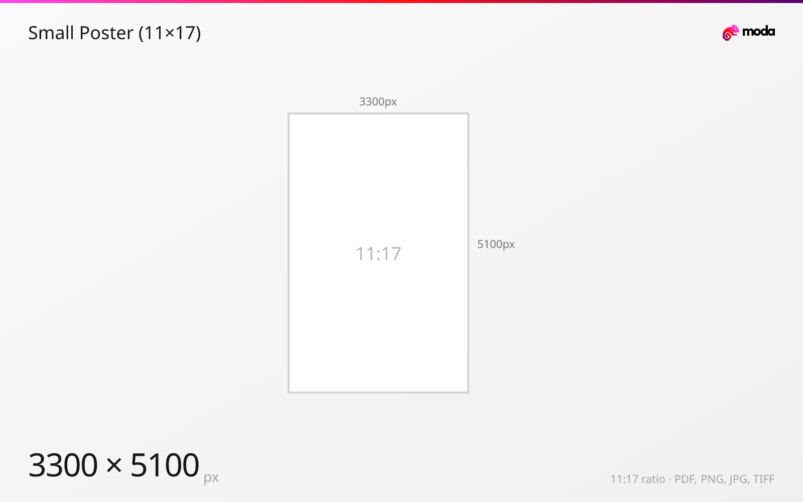 The standard small poster (11×17) size is 279.4 × 431.8 mm (11 × 17 inches), or 3300 × 5100 pixels at 300 DPI.