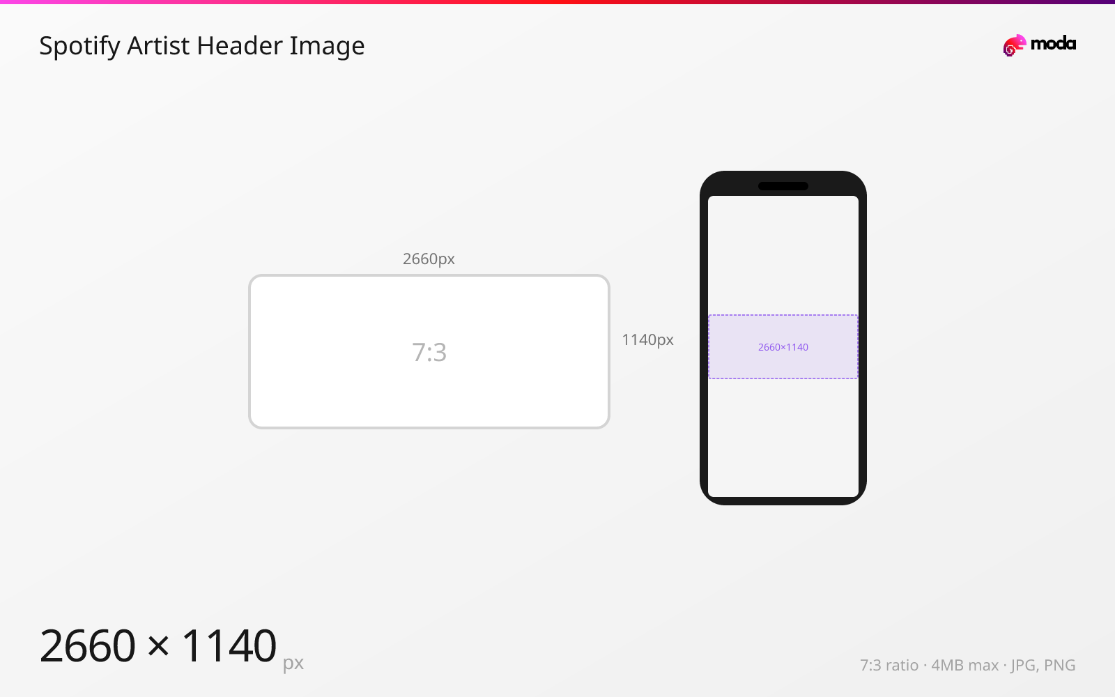 The recommended Spotify artist header image size is 2660 × 1140 pixels (7:3 aspect ratio).