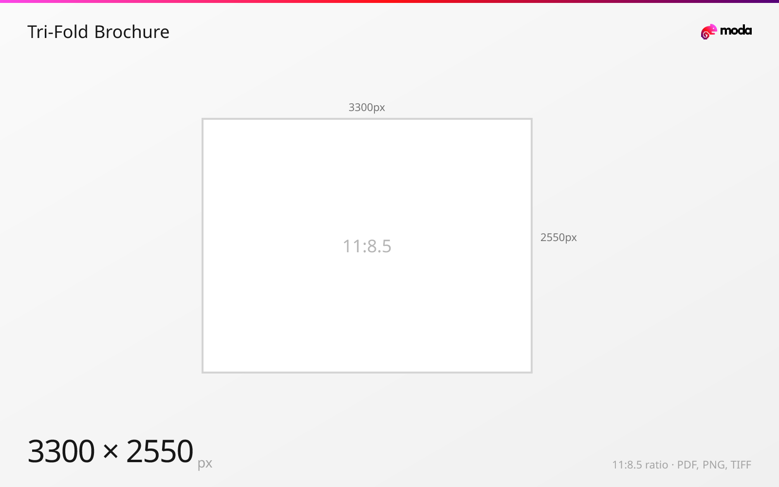 The standard tri-fold brochure size is 279.4 × 215.9 mm (11 × 8.5 inches), or 3300 × 2550 pixels at 300 DPI.