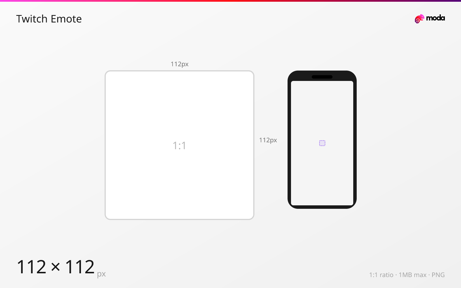 Twitch emotes are 112×112 pixels minimum in a 1:1 square format — though you can upload up to 4096×4096 and Twitch will downscale. Emotes are PNG only, under 1MB per file. They're displayed at 28px, 56px, and 112px across the platform depending on context.