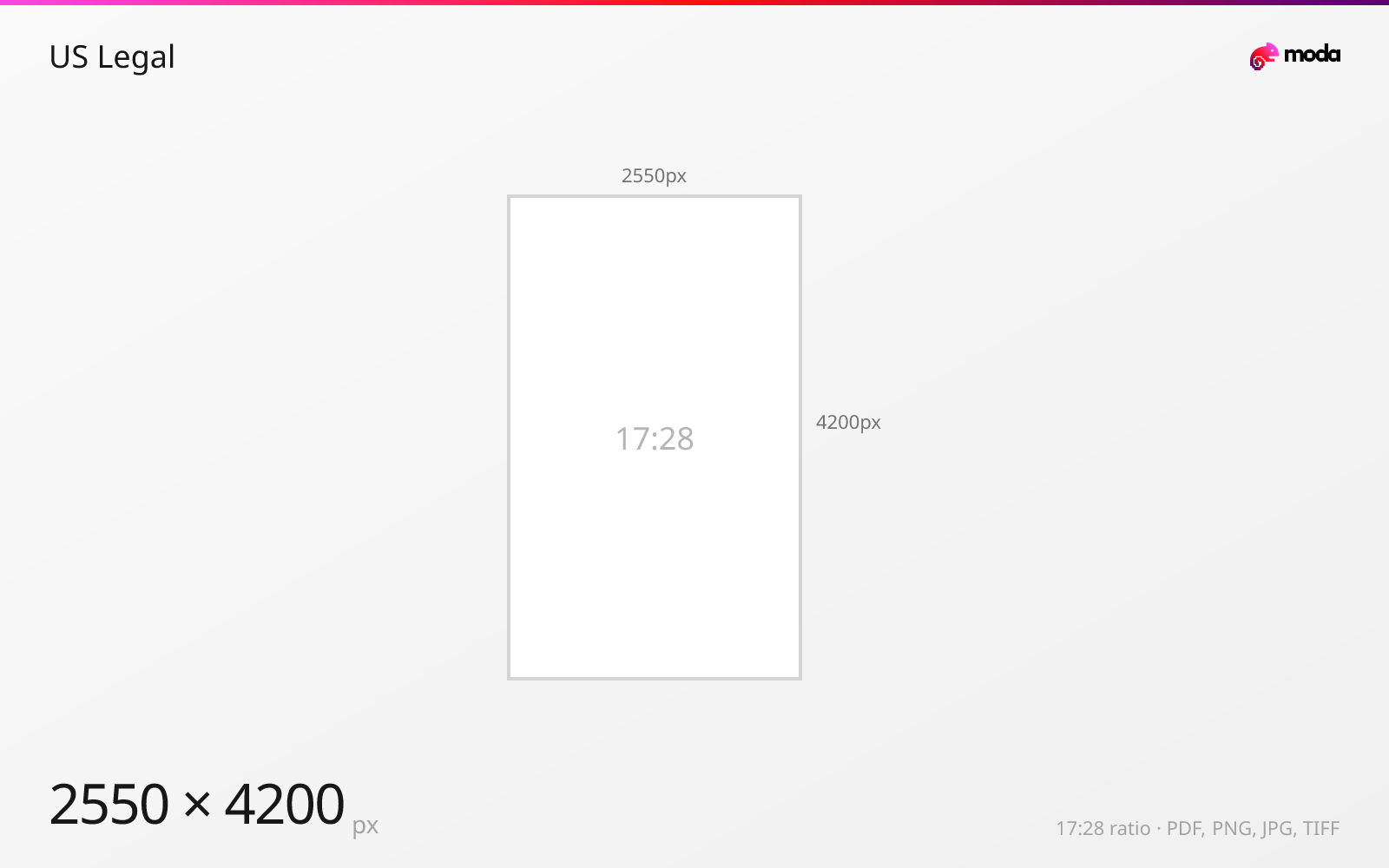 US Legal paper is 8.5×14 inches (215.9×355.6mm). At 300 DPI, that's 2550×4200 pixels. Legal-size paper is 3 inches taller than standard Letter, providing extra space for contracts, legal agreements, and government forms where more content needs to fit on a single page.