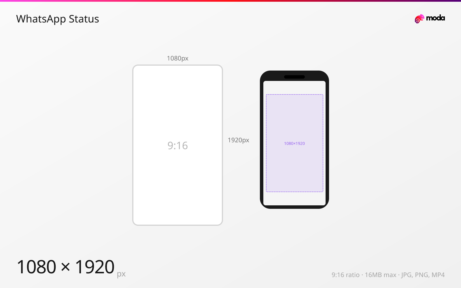 WhatsApp Status images and videos should be 1080×1920 pixels in a 9:16 vertical format — the same full-screen dimensions as Instagram Stories. Status updates disappear after 24 hours. Images are limited to 16MB and videos can be up to 90 seconds long.