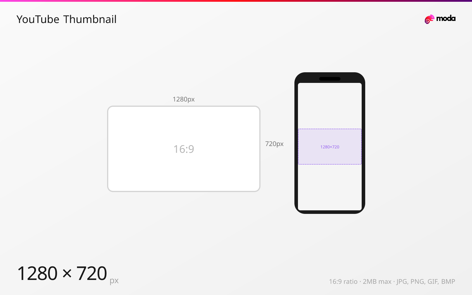 YouTube thumbnails should be 1280×720 pixels with a 16:9 aspect ratio and a minimum width of 640px. The maximum file size is 2MB.